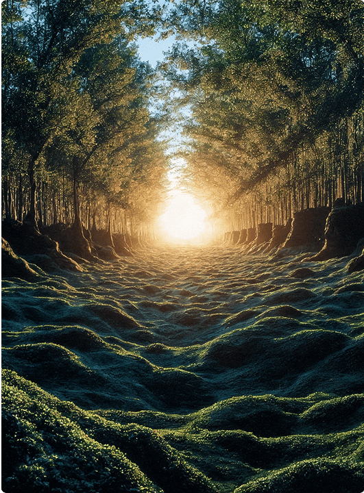 A fantasy surreal landscape of forest pathway lined with tall, symmetrical trees under soft golden sunlight. Sunlight breaks through the trees at the horizon, creating a glowing focal point and a sense of depth.