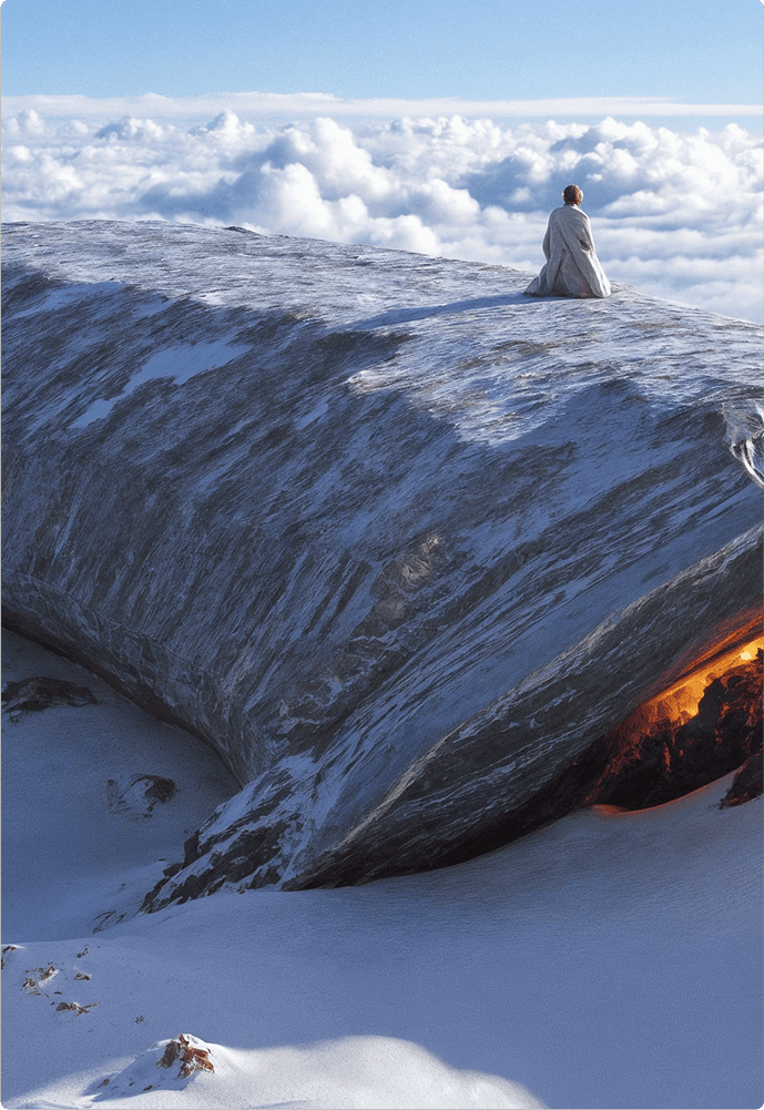 A lone figure in a white cloak sitting on top of a massive, snow-covered, structure frozen in an arctic landscape, cloudy background.
